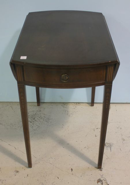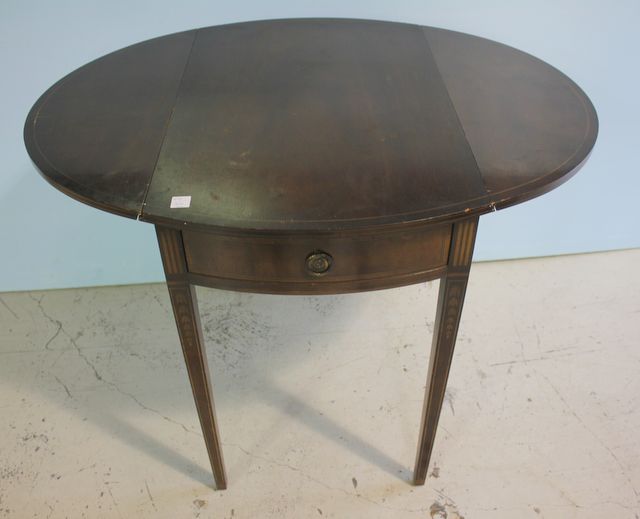 Mahogany Inlaid Pembroke Dropside Table, leaves up; 38" w., leaves down; 19 1/2" w., 28" h., 30" d. Mahogany Inlaid Pembroke Dropside Table, leaves up; 38" w., leaves down; 19 1/2" w., 28" h., 30" d.