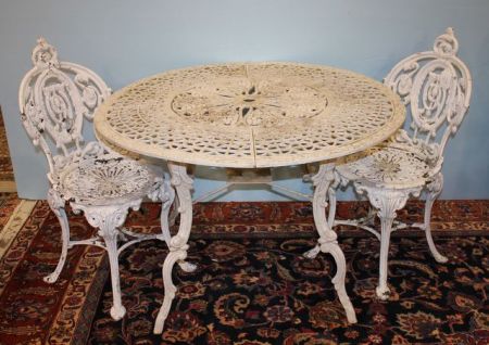 Three Piece Aluminum Table Set; table (40" dia., 26" h.), chairs (34" h.) Three Piece Aluminum Table Set; table (40" dia., 26" h.), chairs (34" h.)