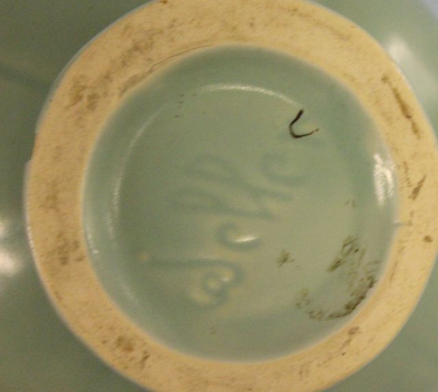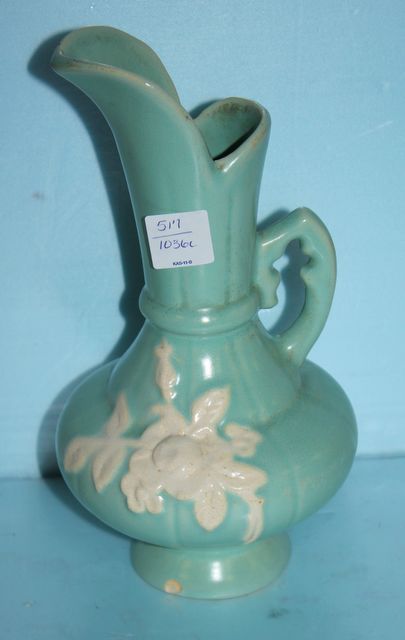 Weller Ewer "Cameo" Light Green with White Flower, chip on base; 9 7/8" h. Weller Ewer "Cameo" Light Green with White Flower, chip on base; 9 7/8" h.