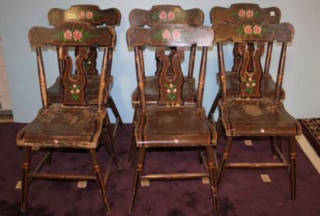 Set of Six Early Stenciled Painted Chairs; 34" h. Set of Six Early Stenciled Painted Chairs; 34" h.