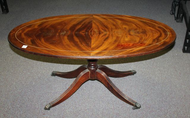 Vintage Duncan Phyfe Style Coffee Table with Brass Paw Feet, inlay small band; 39 1/2" w., 19" h. Vintage Duncan Phyfe Style Coffee Table with Brass Paw Feet, inlay small band; 39 1/2" w., 19" h.