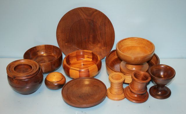 Twelve Vintage Wood Turned Pieces by Alvin Rose, which include; bowls (5"), toothpick holder, flat saucer, ring or salt box 2 3/4" dia., one communion cup 3 1/2" x 3", candle holder 4" h. Twelve Vintage Wood Turned Pieces by Alvin Rose, which include; bowls (5"), toothpick holder, flat saucer, ring or salt box 2 3/4" dia., one communion cup 3 1/2" x 3", candle holder 4" h.
