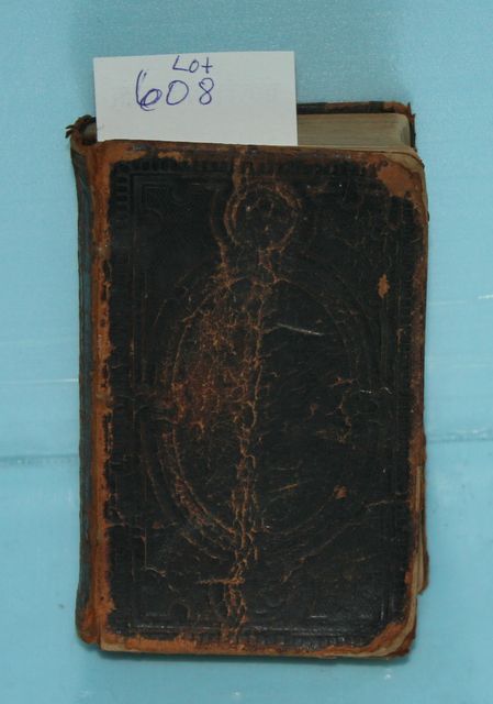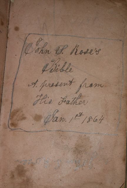 Small 1863 Holy Bible; New York American Bible Society presented to John Rose by his father Jan 1st 1864, cracks from age in binding, cover worn 3 1/2" w., 5" h. Small 1863 Holy Bible; New York American Bible Society presented to John Rose by his father Jan 1st 1864, cracks from age in binding, cover worn 3 1/2" w., 5" h.