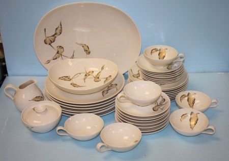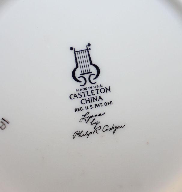 Castleton "Lyana" Pattern China, including; seven dinner plates, eight salad plates, seven bread plates, six cups, seven saucers, one sugar, one creamer, one oval vegetable bowl, one platter; total 39 pieces Castleton "Lyana" Pattern China, including; seven dinner plates, eight salad plates, seven bread plates, six cups, seven saucers, one sugar, one creamer, one oval vegetable bowl, one platter; total 39 pieces