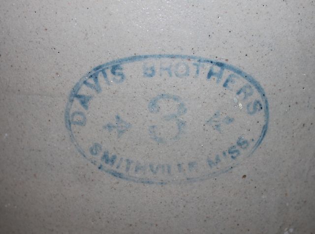 Three Gallon Crock Butter Churn, stamped Smithville Miss Davis Brothers 13 1/2" h., 8 1/4" dia. Three Gallon Crock Butter Churn, stamped Smithville Miss Davis Brothers 13 1/2" h., 8 1/4" dia.