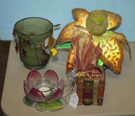 Four Decorative Candleholders consisting of a Flower with Bees, a Palm Tree, a Vase and Books; all candleholders are 3" w., 3 1/2" h. Four Decorative Candleholders consisting of a Flower with Bees, a Palm Tree, a Vase and Books; all candleholders are 3" w., 3 1/2" h.