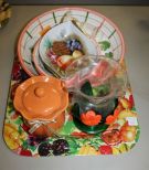 Large Rectangular Plastic Tray with Painted Bowls (one chipped), Vases, and a Covered Jar Large Rectangular Plastic Tray with Painted Bowls (one chipped), Vases, and a Covered Jar