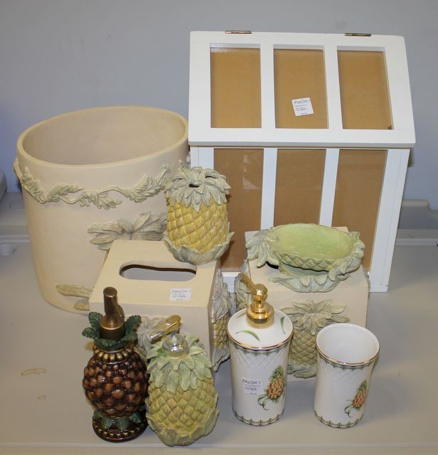 Group of Eleven Miscellaneous Items including Kleenex boxes, soap dispensers, and a waste basket Group of Eleven Miscellaneous Items including Kleenex boxes, soap dispensers, and a waste basket