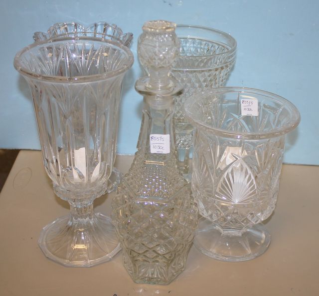 855 Four Glass Vases and a Pressed Glass Decanter