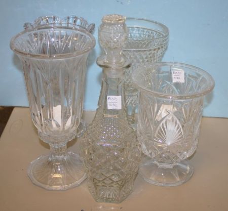 Four Glass Vases and a Pressed Glass Decanter Four Glass Vases and a Pressed Glass Decanter