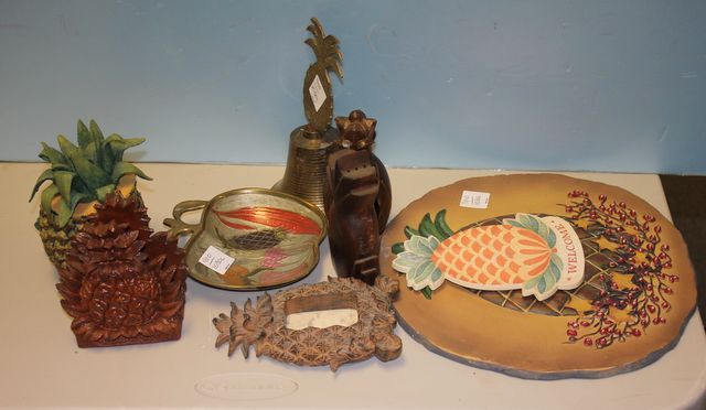 Group of Decorative Items, including; pineapple plaques, frame, napkin holder, brass bell and a frame Group of Decorative Items, including; pineapple plaques, frame, napkin holder, brass bell and a frame