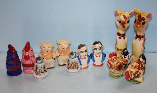 Six Pairs of Handpainted Salt and Pepper shakers, Roosters (Japan), Men (Japan) Pigs (Shawnee), Horse guards parade, tower bridge, roosters (Japan). Six Pairs of Handpainted Salt and Pepper shakers, Roosters (Japan), Men (Japan) Pigs (Shawnee), Horse guards parade, tower bridge, roosters (Japan).