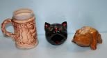 Three Pieces of Decorative Pottery Items; Handpainted Mug (Japan) 5"h., Handpainted Cat (marked), Glazed Frog (Japan). Three Pieces of Decorative Pottery Items; Handpainted Mug (Japan) 5"h., Handpainted Cat (marked), Glazed Frog (Japan).