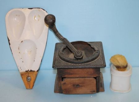 Group of Three Vintage Collectibles; Franco American Coffee Grinder, Pond's barber, Tray. Group of Three Vintage Collectibles; Franco American Coffee Grinder, Pond's barber, Tray.
