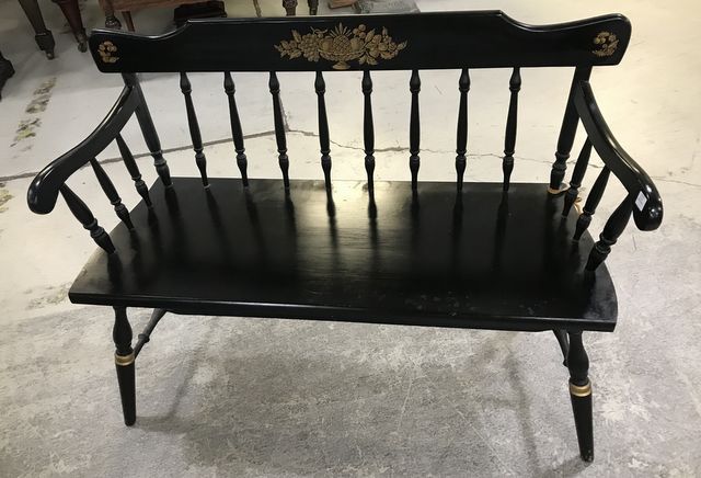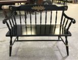 Modern Hitchcock Colonial Style Bench, floral stencil imagery, spindle back arm bench, black and gold accents, 33"h., 45"w. Modern Hitchcock Colonial Style Bench, floral stencil imagery, spindle back arm bench, black and gold accents, 33"h., 45"w.