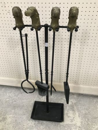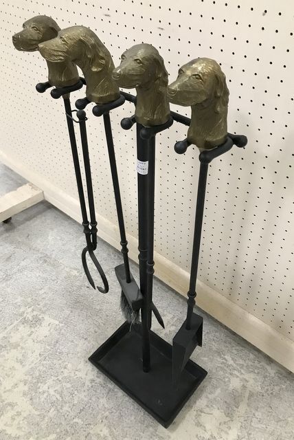 Unique Brass Dog Head Fire Place Tool Set, metal stand, tongs, broom, poker, shovel, 36"h. Unique Brass Dog Head Fire Place Tool Set, metal stand, tongs, broom, poker, shovel, 36"h.