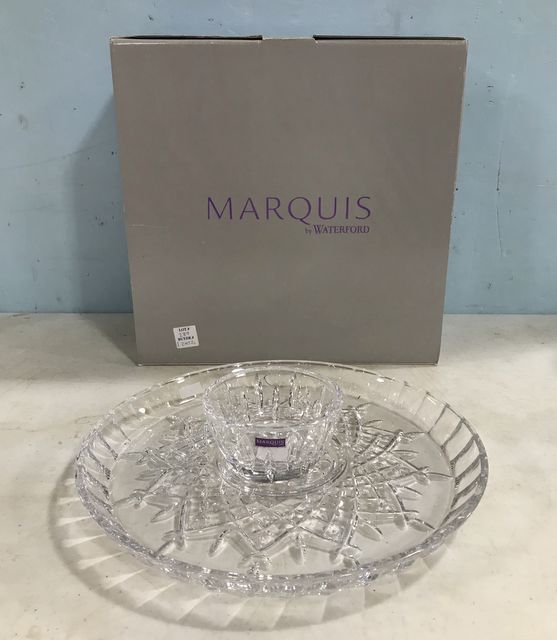 Marquis Waterford "Markham" Chip and Dip server, plate is 13"dia., dip dish is 2"h., 4 1/2"dia., come with box. Marquis Waterford "Markham" Chip and Dip server, plate is 13"dia., dip dish is 2"h., 4 1/2"dia., come with box.