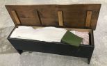 Primitive Reproduction Window Bench Storage Trunk, oak top with painted base, lift top which includes linens and quilts, good condition, 19"h., 48"w., 14"d. Primitive Reproduction Window Bench Storage Trunk, oak top with painted base, lift top which includes linens and quilts, good condition, 19"h., 48"w., 14"d.