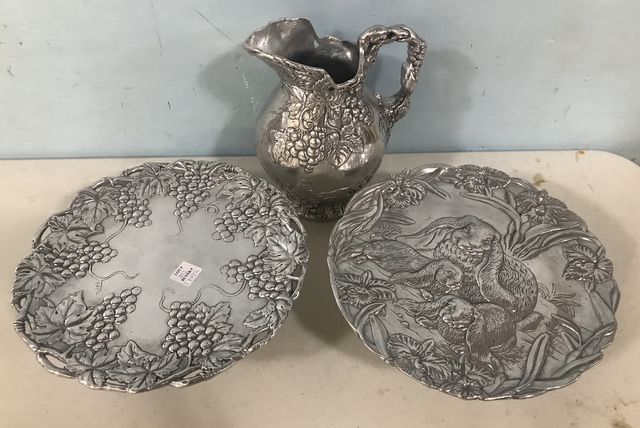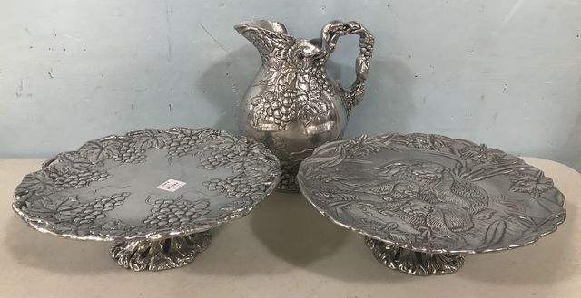 Arthur Court pewter grape pattern water pitcher 10"h., Arthur Court grape pattern compote cake stand 4"h., 12"dia., Arthur Court Rabbit pattern cake stand, 4"h., 12"dia. Arthur Court pewter grape pattern water pitcher 10"h., Arthur Court grape pattern compote cake stand 4"h., 12"dia., Arthur Court Rabbit pattern cake stand, 4"h., 12"dia.