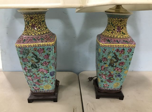 Pair of Oriental Style Modern Table Lamps, matching pair, ceramic hand painted with wood bases, brass oriental style finials, 33"h. Pair of Oriental Style Modern Table Lamps, matching pair, ceramic hand painted with wood bases, brass oriental style finials, 33"h.