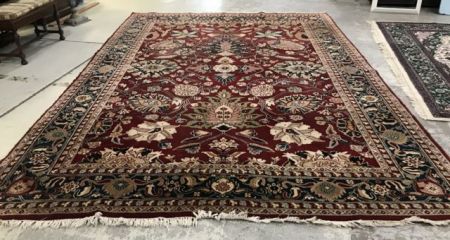 Large Hand Woven Area Rug, 100 % percent wool, 9'11 x 14.1', light age wear, good condition, green, maroon, floral pattern. Large Hand Woven Area Rug, 100 % percent wool, 9'11 x 14.1', light age wear, good condition, green, maroon, floral pattern.