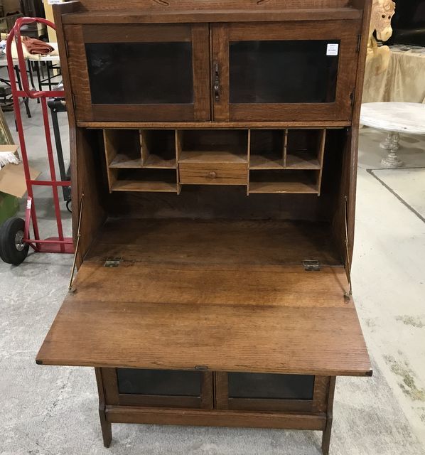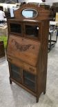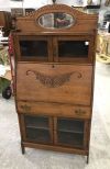Antique Oak Secretary Desk Bookcase, low profile, drop front writing desk, glass doors, single drawer, beveled mirror crest, 60"h., 30"w., 11"d. Antique Oak Secretary Desk Bookcase, low profile, drop front writing desk, glass doors, single drawer, beveled mirror crest, 60"h., 30"w., 11"d.