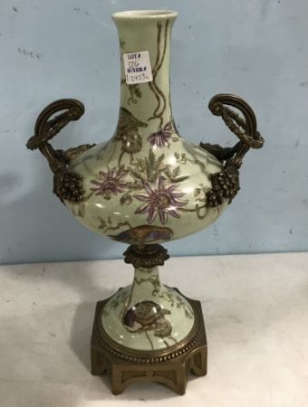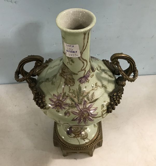 Mark Roberts Decor Ceramic Urn, brass handles and base, bird designs, 15"h. Mark Roberts Decor Ceramic Urn, brass handles and base, bird designs, 15"h.