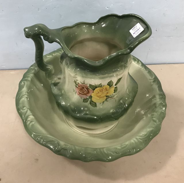 Hand Painted Ceramic Pitcher and Bowl, water pitcher 11"h., and water washing bowl 15"dia. Hand Painted Ceramic Pitcher and Bowl, water pitcher 11"h., and water washing bowl 15"dia.