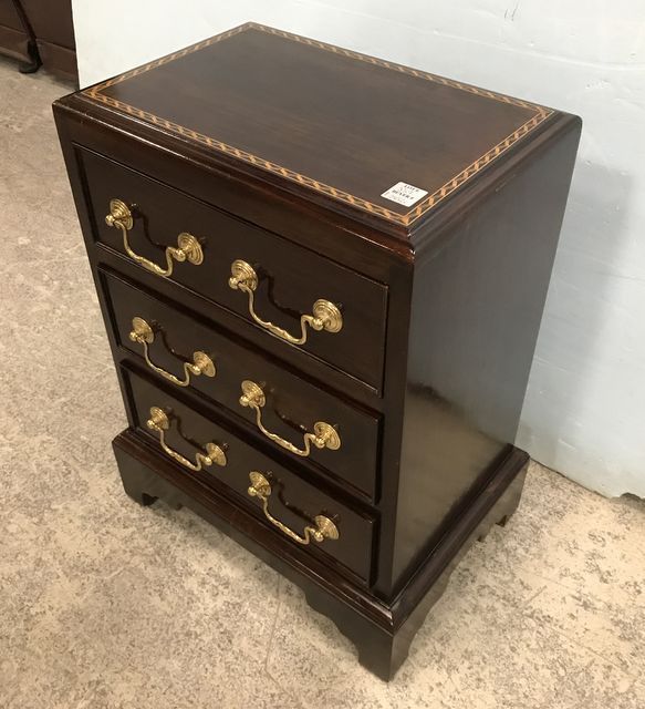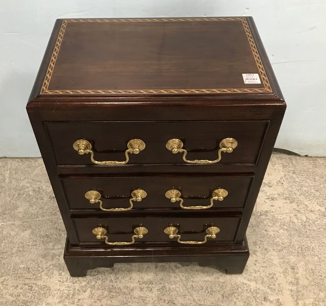 Mahogany Chippendale Style Three Drawer Accent Chest, inlaid border trim, brass hardware, 22"h., 15"w., 10"d. Mahogany Chippendale Style Three Drawer Accent Chest, inlaid border trim, brass hardware, 22"h., 15"w., 10"d.