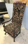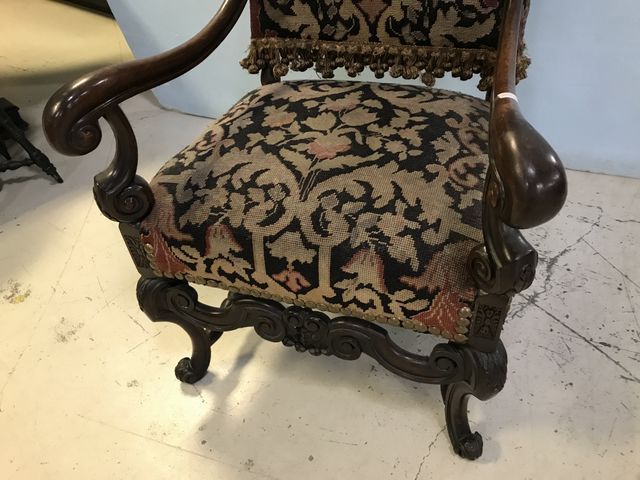 Antique French Style High Back Hall Arm, arm chair, needle point upholstery with Geisha center piece, needs some cleaning, one arm has slight crack by backrest, brass tacked border, 51"h. Antique French Style High Back Hall Arm, arm chair, needle point upholstery with Geisha center piece, needs some cleaning, one arm has slight crack by backrest, brass tacked border, 51"h.