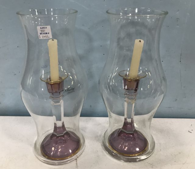 Pair of Williamsburg Crystal Thick Hurricane Shades , with amethyst color glass candle holders, 15"h. Pair of Williamsburg Crystal Thick Hurricane Shades , with amethyst color glass candle holders, 15"h.