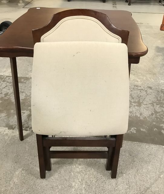 Modern Cherry Fold Out Game Table, good condition, included fold out cherry chair, 29"h., 32"w. Modern Cherry Fold Out Game Table, good condition, included fold out cherry chair, 29"h., 32"w.