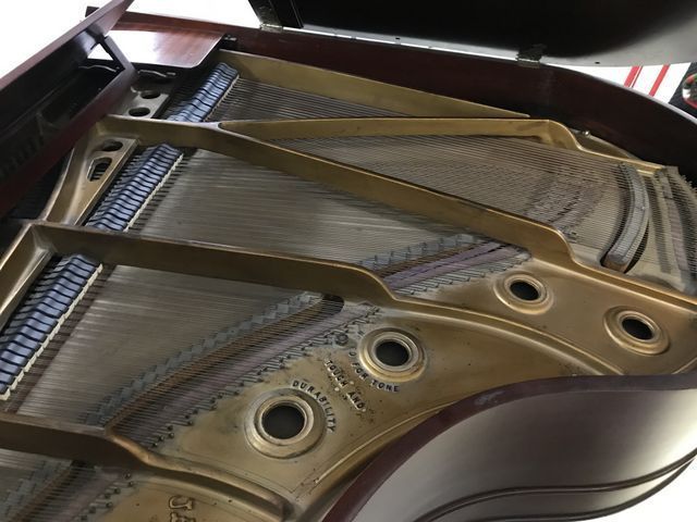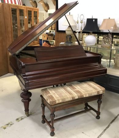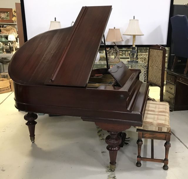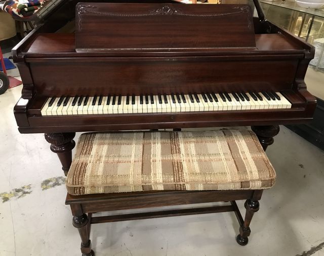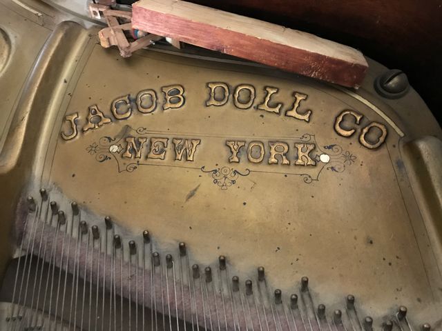 1920-1930's Jacob and Doll, New York Baby Grand Piano, empire style with William and Mary leaning, mahogany wood, ivory keys, over composition genuine Philippine mahogany wood, on casters, working condition, could use a tune, 38"h., 5'5 long. 1920-1930's Jacob and Doll, New York Baby Grand Piano, empire style with William and Mary leaning, mahogany wood, ivory keys, over composition genuine Philippine mahogany wood, on casters, working condition, could use a tune, 38"h., 5'5 long.