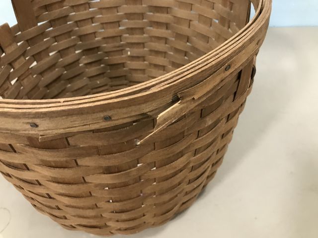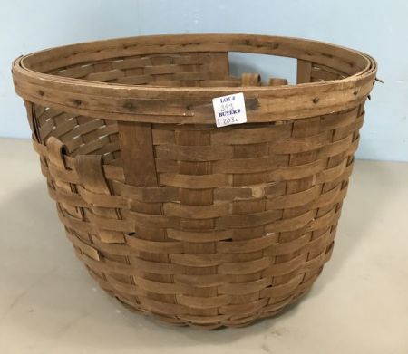 Longaberger Hand Woven Basket, handled, hardwood spit maple, signed on bottom, has some small damage areas, 12"h., 16"w. Longaberger Hand Woven Basket, handled, hardwood spit maple, signed on bottom, has some small damage areas, 12"h., 16"w.