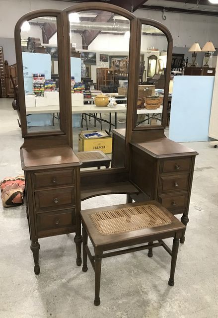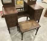 Vintage Mahogany Drop Front Vanity, 6 drawers, tri fold mirror, minor finish wear, stool with cane top, 68"h., 47"w., 18"d. Vintage Mahogany Drop Front Vanity, 6 drawers, tri fold mirror, minor finish wear, stool with cane top, 68"h., 47"w., 18"d.