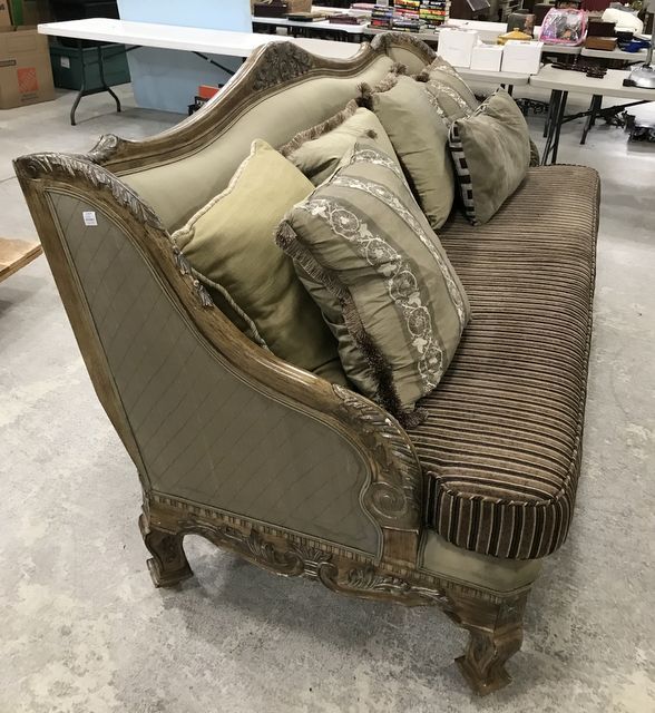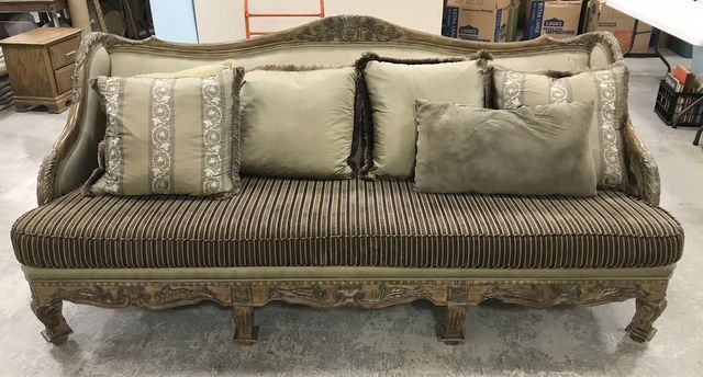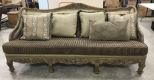 Antique Reproduction French Style formal Sofa, distressed painted wood frame, single cushion, silk sides and back, light water spots on border, throw pillows, goose feather/down, 43"h., 8'. Antique Reproduction French Style formal Sofa, distressed painted wood frame, single cushion, silk sides and back, light water spots on border, throw pillows, goose feather/down, 43"h., 8'.