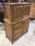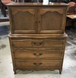 Vintage French Style Cherry Chest of Chest, three drawers, two door with interior drawers, has finish wear, 52"h., 38"w., 18"d. Vintage French Style Cherry Chest of Chest, three drawers, two door with interior drawers, has finish wear, 52"h., 38"w., 18"d.