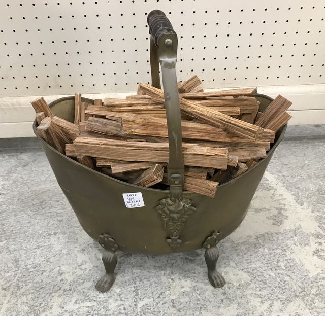 Vintage Copper Kindling Wood Bin, handled, footed, included kindling, 14"h., 14"w. Vintage Copper Kindling Wood Bin, handled, footed, included kindling, 14"h., 14"w.