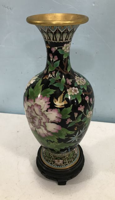 Chinese Cloisonne Brass Enamel Black Vase, floral designs, markers tag, wood stand, 12"h. Chinese Cloisonne Brass Enamel Black Vase, floral designs, markers tag, wood stand, 12"h.