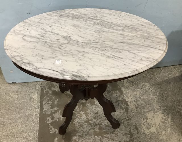 Victoria Oval Marble Top Parlor Table, white Italian marble (marble has light scratches), mahogany pedestal base, 28"h., 34"w. Victoria Oval Marble Top Parlor Table, white Italian marble (marble has light scratches), mahogany pedestal base, 28"h., 34"w.