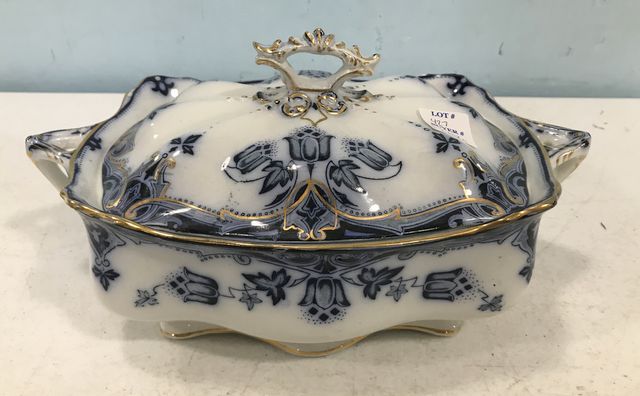 Flow Blue Tureen And Lind by T. Rathbone & Co., Staffordshire potteries, England, c1912, hand painted, good condition, 5 1/2"h., 11"w. Flow Blue Tureen And Lind by T. Rathbone & Co., Staffordshire potteries, England, c1912, hand painted, good condition, 5 1/2"h., 11"w.