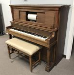 Early 1900's Conway Upright Player Piano, mahogany, keys work, pump, player will player but needs work to run fluid, comes with paper music rolls, has some chips on keys, Conway Company Boston, Mass., 56"h., 58"w., 30"d. Early 1900's Conway Upright Player Piano, mahogany, keys work, pump, player will player but needs work to run fluid, comes with paper music rolls, has some chips on keys, Conway Company Boston, Mass., 56"h., 58"w., 30"d.