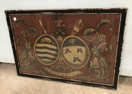 Vintage "Vincit Veritas" Paper Framed Art, glassed, framed, frame has damage, 26"h., 38"w. Vintage "Vincit Veritas" Paper Framed Art, glassed, framed, frame has damage, 26"h., 38"w.