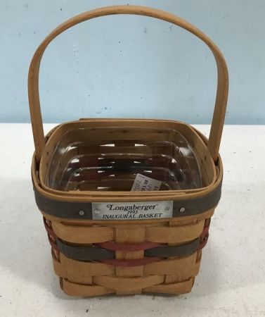 Longaberger 1993 Inaugural Basket, plastic liner, hardwood split maple, handled, good condition, 8"h., 6"w. Longaberger 1993 Inaugural Basket, plastic liner, hardwood split maple, handled, good condition, 8"h., 6"w.