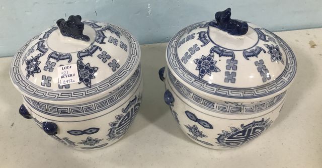 Pair of Modern Blue and White Oriental Jars, 9"h. Pair of Modern Blue and White Oriental Jars, 9"h.