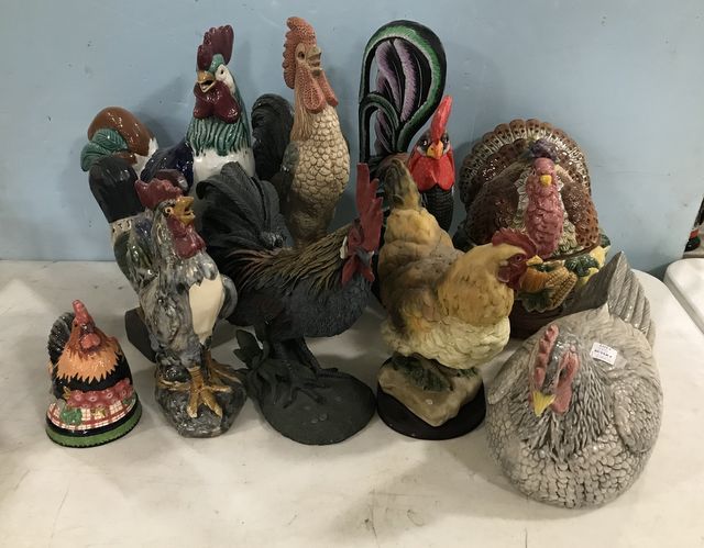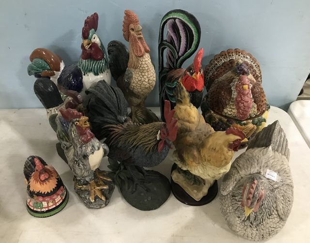 Resin, ceramic, porcelain hand painted rooster collection, hand painted turkey tureen, tallest is 18"h. Resin, ceramic, porcelain hand painted rooster collection, hand painted turkey tureen, tallest is 18"h.