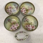 Set of Four Nippon Nut Dishes and Small Nippon Dish, hand painted Nippon dishes footed, 3"dia., floral design. Set of Four Nippon Nut Dishes and Small Nippon Dish, hand painted Nippon dishes footed, 3"dia., floral design.