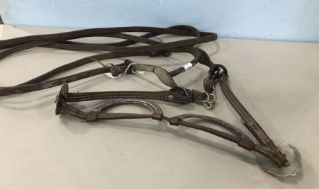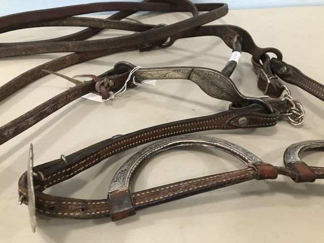 Two Ear Western Bridle with Sterling Overlay Buckles, leather, used condition. Two Ear Western Bridle with Sterling Overlay Buckles, leather, used condition.