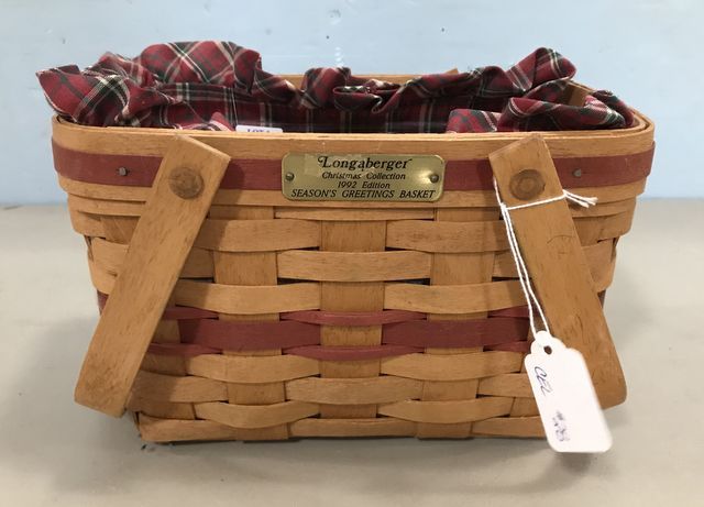 Longaberger Christmas Collection 1992 Season's Greetings Basket, hardwood split maple, handled, label on bottom, Christmas plaque, 6"h., 10"w. Longaberger Christmas Collection 1992 Season's Greetings Basket, hardwood split maple, handled, label on bottom, Christmas plaque, 6"h., 10"w.