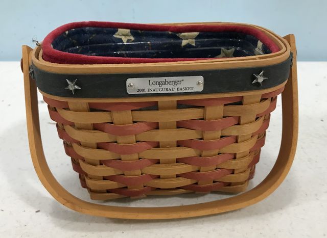 Longaberger 2001 Inaugural Basket, hardwood split maple, plastic filler, handled, good condition, 4"h., 6"w. Longaberger 2001 Inaugural Basket, hardwood split maple, plastic filler, handled, good condition, 4"h., 6"w.